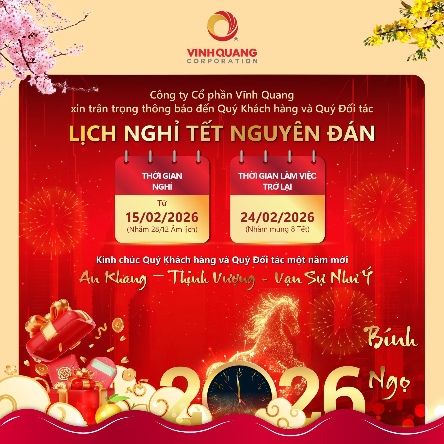 Vĩnh Quang Corporation trân trọng thông báo đến Quý Khách hàng và Quý Đối tác lịch nghỉ Tết Nguyên đán 2026 như sau: